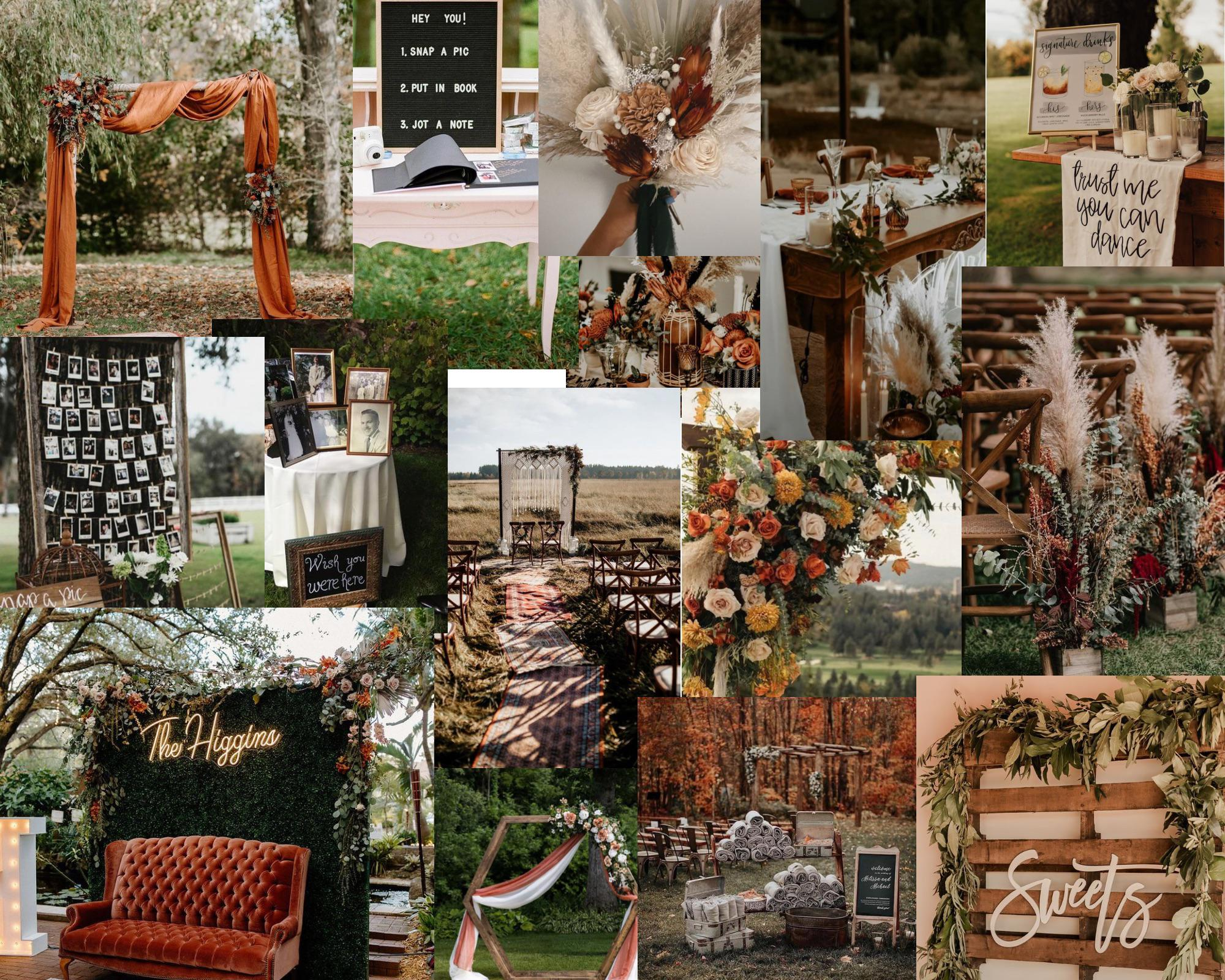 After establishing your colors, begin gathering inspiration images. This is where creativity flows freely. Look for images that resonate with you emotionally, even if you’re not sure why. Focus on key areas such as bridal fashion, groom attire, décor setups, floral arrangements, table settings, lighting, and even photography styles. At this stage, quantity matters more than precision, collect broadly, then refine later. The goal is to build a pool of ideas that you can draw from as patterns begin to emerge. But don't just look for wedding photos, look for textures and feelings.